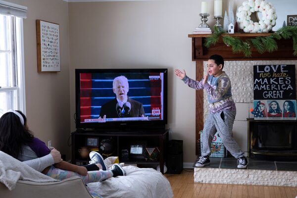 Jackson Smith, 8, cheers and claps as he watches the inauguration with his family at their home in Beverly Hills, Mich.Emily Elconin/Reuters