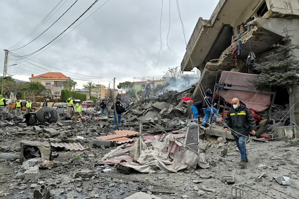 First aid responders are seen at the site of an Israeli air strike that targeted the southern Lebanese village of Kfar Roummane on Thursday.ABBAS FAKIH/AFP/Getty Images