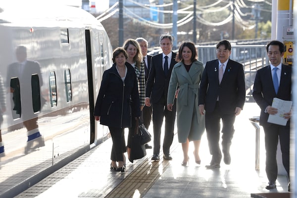 French Foreign Minister Catherine Colonna, Canadian Foreign Minister Melanie Joly, Italy's Foreign Minister Antonio Tajani, U.S. Secretary of State Antony Blinken, German Foreign Minister Annalena Baerbock and Japan’s Foreign Minister Yoshimasa Hayashi arrive at Karuizawa station with for G7 Foreign Ministers' meeting in Karuizawa, Japan, on April 16.MINISTRY OF FOREIGN AFFAIRS OF J/Reuters