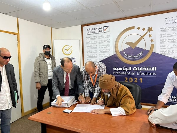 Saif al-Islam al-Gaddafi, son of Libya's former leader Muammar al-Gaddafi, registers as a presidential candidate for the December 24 election, at the registration centre in the southern town of Sebha, Libya, on Nov. 14.KHALED AL-ZAIDY/Reuters