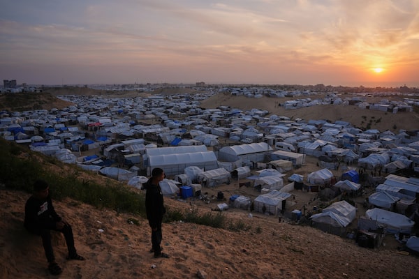 Palestinians youth look on as they stand in an area next to tents at a makeshift camp for displaced people in Khan Younis, southern Gaza Strip on April 9.Abdel Kareem Hana/The Associated Press