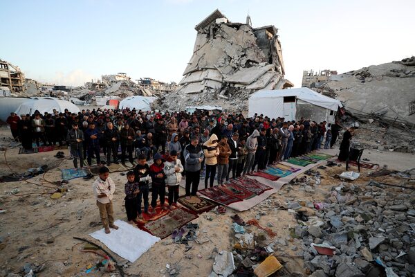 Palestinian Muslims attend Eid al-Fitr prayer marking the end of the holy fasting month of Ramadan, in Jabalia, in the northern Gaza Strip, on March 30.Mahmoud Issa/Reuters