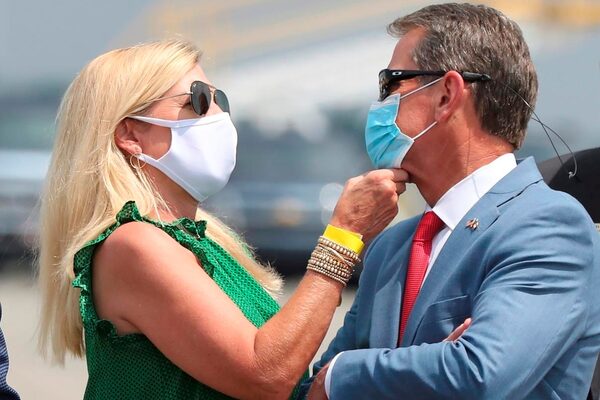 Georgia Gov. Brian Kemp has his mask adjusted while waiting for President Donald Trump to arrive at the UPS Hapeville hub, at Hartsfield-Jackson International Airport, in Atlanta, Ga., on July 15, 2020.The Canadian Press