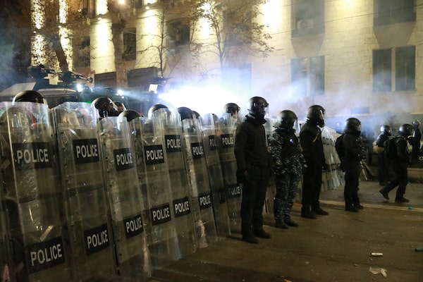Police block a street to stop protesters rallying against the government's decision to suspend negotiations on joining the European Union, in Tbilisi, Georgia, on Dec. 3.Zurab Tsertsvadze/The Associated Press