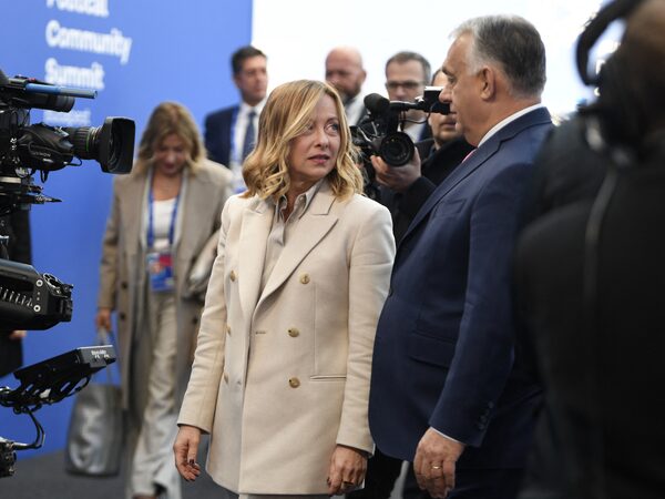 Italy's Prime Minister Giorgia Meloni, left, is greeted by Hungary's Prime Minister Viktor Orban upon her arrival for the European Political Community Summit in Budapest on Nov. 7.FERENC ISZA/AFP/Getty Images
