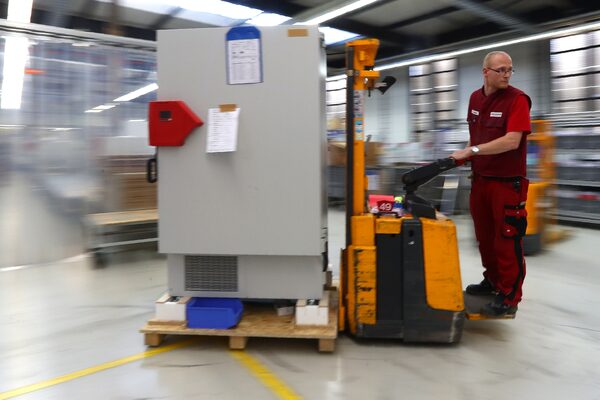A Binder employee transports an ultra-low-temperature freezer in Tuttlingen, Germany, on Nov. 24, 2020.Matthias Schrader/The Associated Press