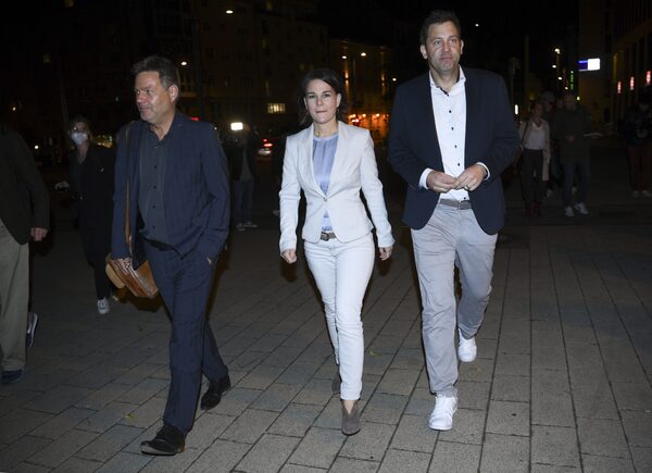 Lars Klingbeil, secretary general of Germany's Social Democratic Party, from right, and Greens co-leaders Annalena Baerbock and Robert Habeck arrive to address the media following their exploratory talks to build a new German government coalition in Berlin, Germany, on Oct. 3, 2021.ANNEGRET HILSE/Reuters