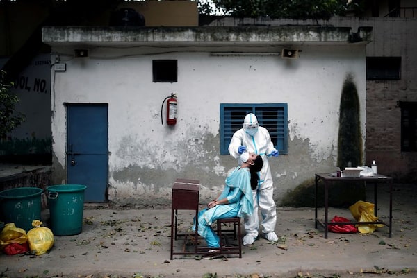 A health worker collects a sample from a person at a school which was turned into a centre to conduct tests for COVID-19, amidst the spread of the disease, in New Delhi, India.ADNAN ABIDI/Reuters
