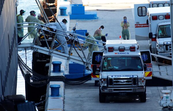 Rescue workers transport a patient from the Zaandam of the Holland America Line cruise ship, afflicted with coronavirus disease (COVID-19), at Port Everglades in Fort Lauderdale, Florida, U.S. April 2, 2020.JOE SKIPPER/Reuters