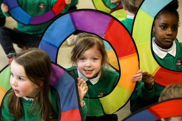 Pupils play last month at the Bangor Integrated Nursery School in County Down. The formerly Protestant institution recently joined a growing list of schools that have officially integrated Catholics and those raised in other faiths – a process encouraged by the GFA.Paul Faith/AFP via Getty Images
