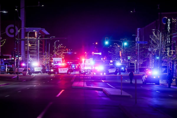 Police vehicles sit outside the Belmar shopping center where authorities say the suspect in a shooting spree that claimed five lives was shot and killed in Lakewood, Colo., on Dec. 27.Michael Ciaglo/Getty Images