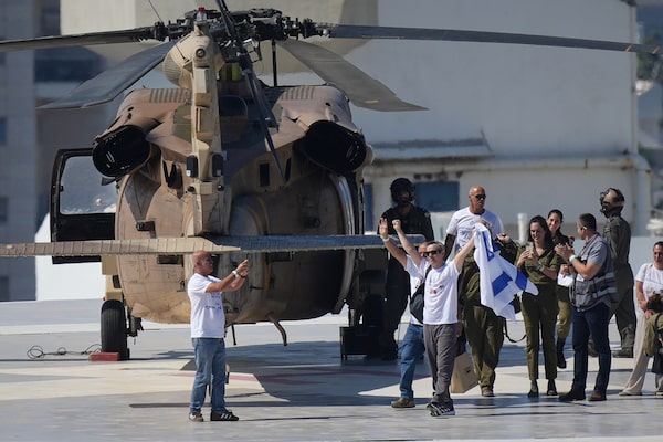 Omri Miran, an Israeli hostage released from the Gaza Strip, waves an Israeli flag after coming off a helicopter at the Ichilov Hospital, in Tel Aviv, Israel on Monday.Ohad Zwigenberg/The Associated Press