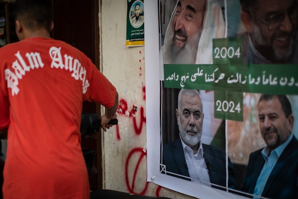 A brand new poster of Hamas members killed, including Ismail Haniyeh (bottom left) is put on the wall the day after the Hamas political leader was killed in a strike in Iran in the Shatila Palestinian refugee camp in Beirut, Lebanon on July 31.Oliver Marsden/The Globe and Mail
