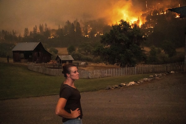 Angela Crawford watches as the McKinney fire burns a hillside above her home in Klamath National Forest, Calif., on July 30.Noah Berger/The Associated Press