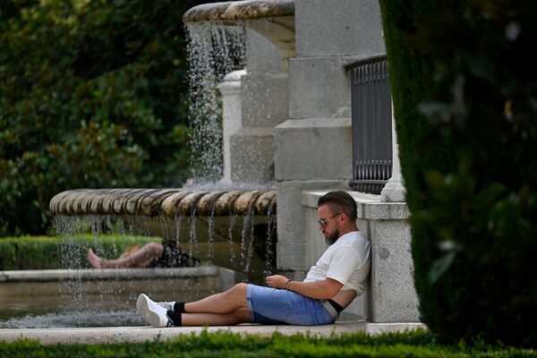 A man sits near a fountain in Madrid on July 18, 2023. Spain issued hot weather red alerts for three regions due to the "extreme" danger posed by scorching temperatures as firefighters made gains in their battle against a blaze raging in the Canary Islands. Weather agency Aemet said temperatures would hit highs between 38 degrees Celsius (100 Fahrenheit) and 42 degrees across much of the drought-stricken country, sending people to seek shade from a blistering sun. (Photo by JAVIER SORIANO / AFP) (Photo by JAVIER SORIANO/AFP via Getty Images)JAVIER SORIANO/AFP/Getty Images