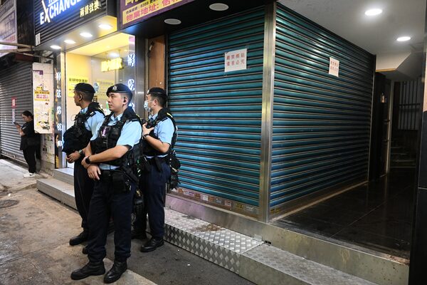 Police gather in Hong Kong's Causeway Bay district on June 4, 2025, where people traditionally gathered annually on June 4 to mourn the victims of China's Tiananmen Square crackdown in 1989 - now banned following a national security law imposed on the city in 2020.PETER PARKS/AFP/Getty Images