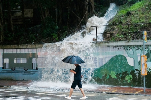 A pedestrian walks past an overflowing hillside drain spilling water onto a street in Hong Kong, which saw its highest-tier rainstorm warning issued for the fourth time in eight days.TOMMY WANG/AFP/Getty Images