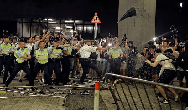 Police officers use pepper spray against protesters in a rally against the proposed amendments to the extradition law at the Legislative Council in Hong Kong, during the early hours of June 10, 2019.Vincent Yu/The Associated Press