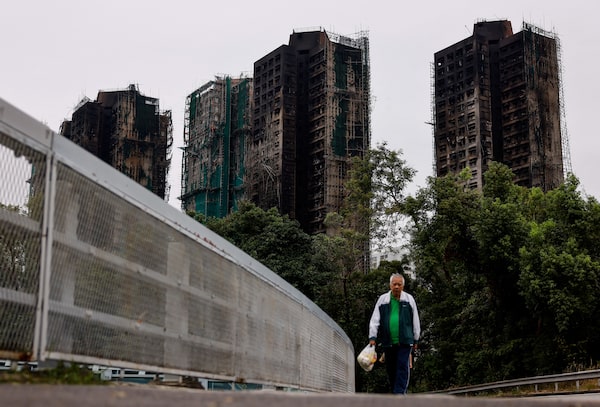 An elderly man walks next to burned buildings of the Wang Fuk Court housing complex after the deadly fire, in Tai Po, Hong Kong, on Sunday.Maxim Shemetov/Reuters