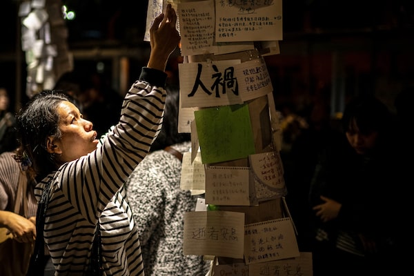 A woman fixes a written note outside Wang Fuk Court on Sunday.PHILIP FONG/AFP/Getty Images