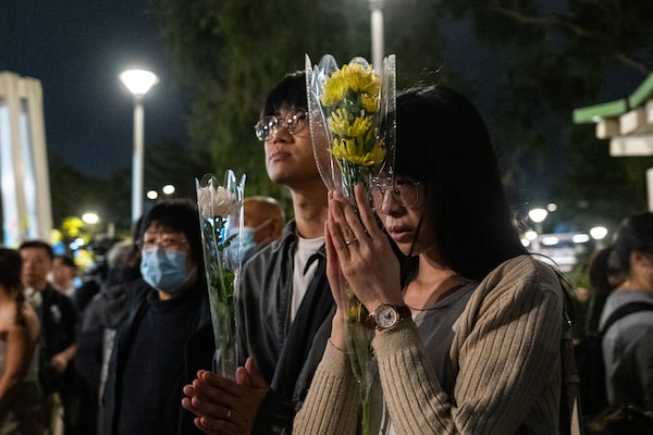 People offer flowers for victims near the site of Wednesday's fire at Wang Fuk Court on Nov. 30.Chan Long Hei/The Associated Press