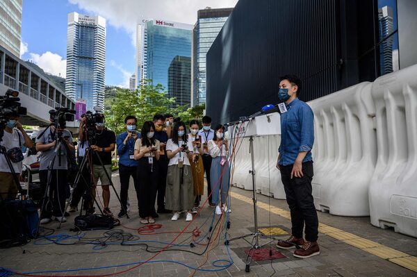 Democratic Party chairperson Lo Kin-hei speaks to the media outside the Legislative Council, in Hong Kong, on May 27.ANTHONY WALLACE/AFP/Getty Images