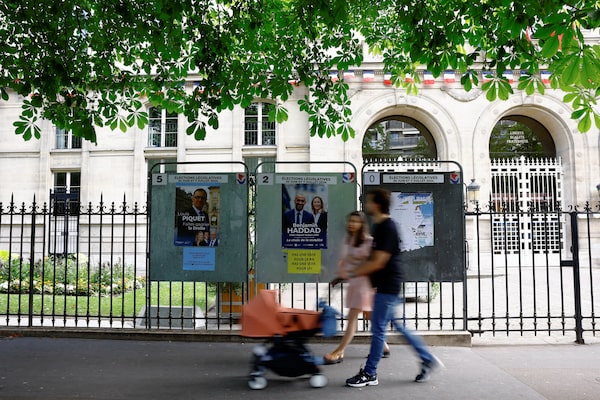 People walk past campaign posters on an election board prior to the second round of the early French parliamentary elections, in Paris, France, July 6, 2024. REUTERS/Sarah MeyssonnierSarah Meyssonnier/Reuters