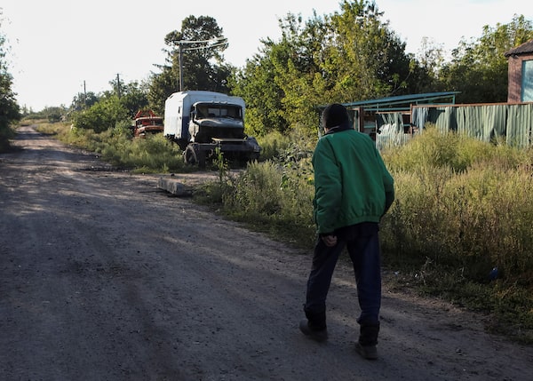 A local resident passes by a destroyed vehicle marked with the symbol "Z", in the village of Hrakove in the Kharkiv region, which was recently liberated by Ukrainian Armed Forces, on Sept. 9.VYACHESLAV MADIYEVSKYY/Reuters