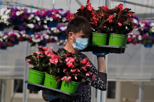 A worker wears a sanitary mask to protect against coronavirus as he works in a greenhouse of the Saracino Flower Farm, in Aprilia, near Rome, Wednesday, April 8, 2020.Alessandra Tarantino/The Associated Press