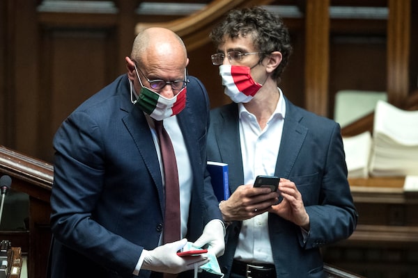 Lawmakers Fabio Rampelli, left, and Galeazzo Bignami wear face masks to protect themselves against the spread of Covid-19, with the colors of the Italian flag, at the Lower Chamber of Deputies, in Rome, Wednesday, April 8, 2020.Roberto Monaldo/LaPresse LaPresse / Roberto Monaldo/The Associated Press