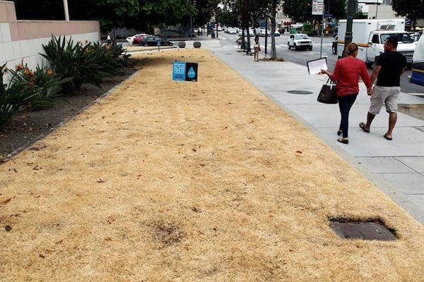 In 2015, a dried-out lawn at Los Angeles City Hall bears a sign explaining that irrigation was shut off due to drought.Nick Ut/The Canadian Press
