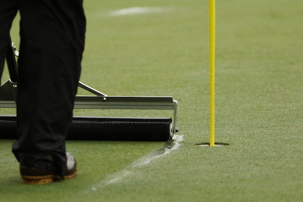 A greenskeeper clears water from the seventh green at the Augusta National Golf Club in Georgia.Patrick Smith/Getty Images