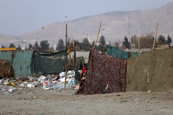 An internally displaced girl peers through the curtain of her temporary home in Kabul, Afghanistan, on Jan. 18, 2021.Rahmat Gul/The Associated Press