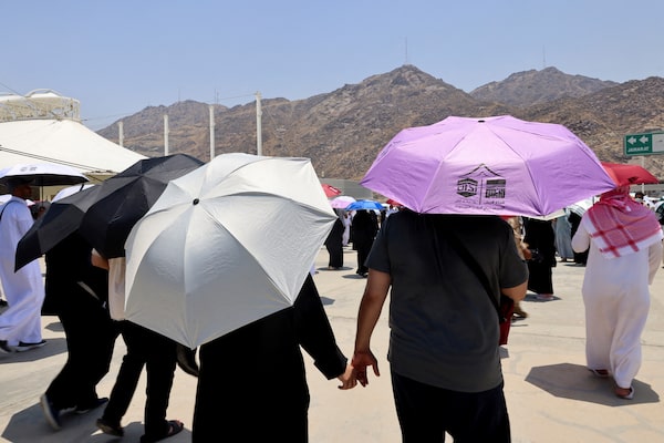 Muslim pilgrims hold hands as they walk with umbrellas to the site where people take part in the Satan stoning ritual, during the annual haj pilgrimage in Mina, Saudi Arabia, on June 18.Saleh Salem/Reuters