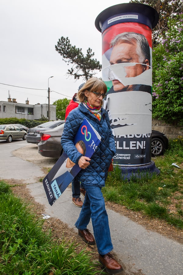 A woman holding an election campaign poster for the Tisza party walks past a vandalized poster showing outgoing Hungarian Prime Minister Viktor Orban in Budapest on Monday.FERENC ISZA/AFP/Getty Images