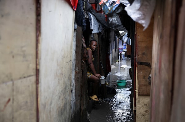 A woman stands at the entrance of her makeshift home during heavy rains brought by the outer bands of Hurricane Melissa, at a shelter housing Haitians displaced by gang violence, in Port-au-Prince.Claudia Daut/Reuters