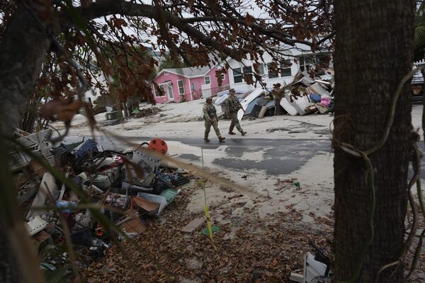 Members of the Florida Army National Guard check for any remaining residents in nearly-deserted Bradenton Beach, where piles of debris from Hurricane Helene still sit outside damaged homes, ahead of the arrival of Hurricane Milton, Tuesday, Oct. 8, 2024, on Anna Maria Island, Fla. (AP Photo/Rebecca Blackwell)Rebecca Blackwell/The Associated Press