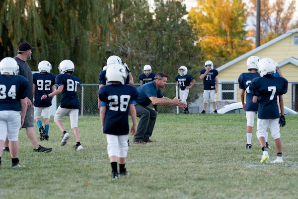Volunteer coach Cody Edwards works with Grade 5 and 6 footballers at Grangeville Elementary/Middle School. Mask mandates in a nearby school district were quickly struck down after an uproar from parents.