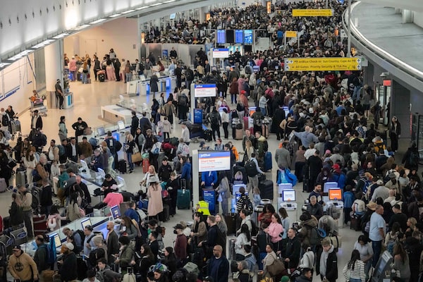 People wait in a TSA line at the John F. Kennedy International Airport on Sunday. Hundreds of thousands of homeland security workers, including from the TSA, have worked without pay since Congress failed to renew DHS funding last month.Yuki Iwamura/The Associated Press