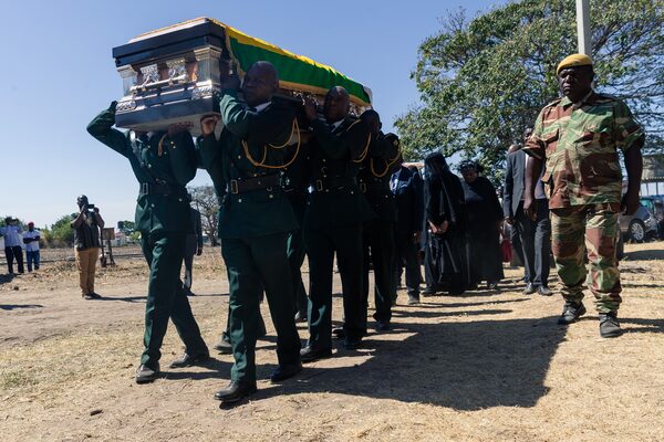 The coffin of former Zimbabwean president Robert Mugabe arrives for burial at his home village, Kutama, on Sept. 28, 2019. Three weeks earlier, Mr. Mugabe had died at the age of 95 in Singapore, where he had lived since his ouster in a 2017 coup.JEKESAI NJIKIZANA/AFP via Getty Images