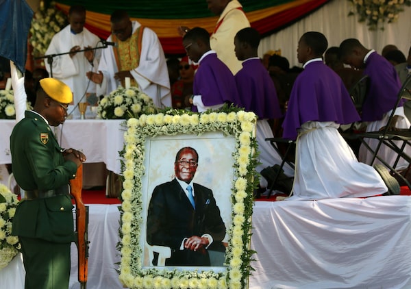 In Kutama, soldiers stand beside a picture of Mr. Mugabe during a church service on the day of his burial in 2019.Philimon Bulawayo/Reuters