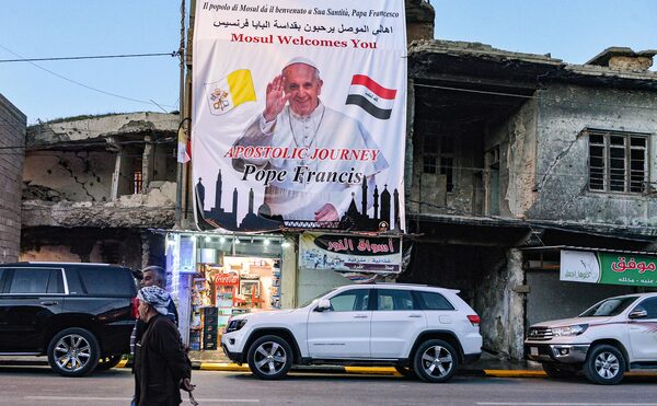 A poster welcoming Pope Francis hangs above a ruined building in the old city of Iraq's northern Mosul on March 6, 2021, amidst preparations ahead of the pontiff's visit.ZAID AL-OBEIDI/AFP/Getty Images
