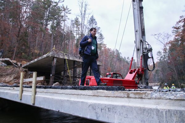 Mr. Marr, the elections director in North Carolina’s Polk County, clambers up metal scaffolding that is now the only way up the river’s eastern bank. On the other side, local resident Mike Marsteller stops his car near the ragged edge where the pavement ends. He opens his window and hands Mr. Marr a dozen envelopes.