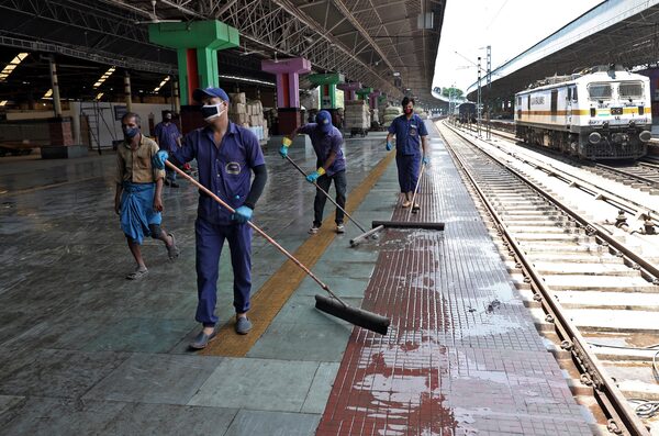 Workers clean a platform at the Howrah Junction railway station, on the outskirts of Kolkata, India, on May 11, 2020.RUPAK DE CHOWDHURI/Reuters