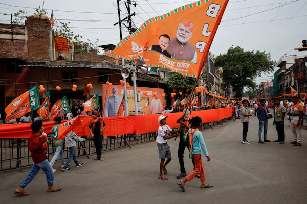 Boys wave a Bharatiya Janata Party (BJP) flag before the start of India's Prime Minister Narendra Modi's election campaign rally in Kanpur, India, May 4.Francis Mascarenhas/Reuters