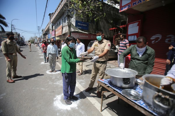 People line up to receive food during a lockdown to prevent the spread of the new coronavirus, in Jammu, India, on April 8, 2020.Channi Anand/The Associated Press