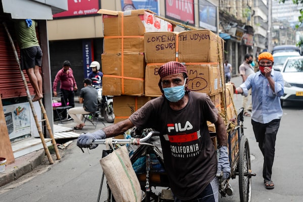 People wearing face masks carry materials for delivery on a transport rickshaw in Kolkata, India, Aug. 22, 2020.Bikas Das/The Associated Press