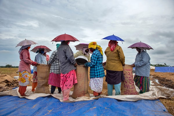 Indian farmers pack paddy crop after harvest in Alappuzha, Kerala state, India, Saturday, Dec.5, 2020.R S Iyer/The Associated Press