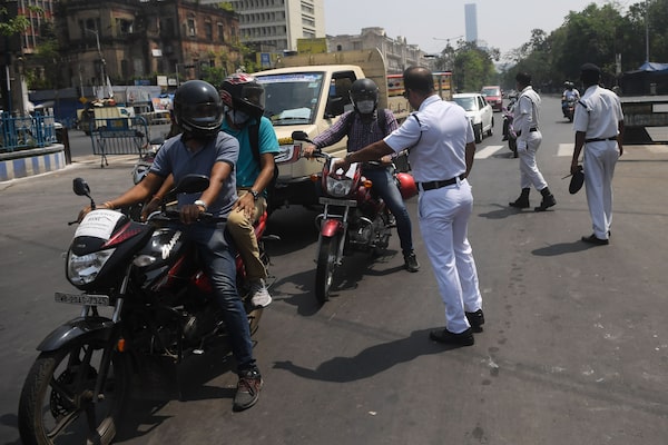 Policemen check motorists during a government-imposed nationwide lockdown as a preventive measure against the novel coronavirus, in Kolkata, India, on April 13, 2020.DIBYANGSHU SARKAR/AFP/Getty Images