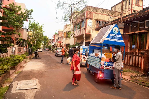 Local residents purchase grocery commodities from government sponsored mobile outlets during a government-imposed nationwide lockdown as a preventive measure against the COVID-19 coronavirus, in Kolkata on Thursday.DIBYANGSHU SARKAR/AFP/Getty Images